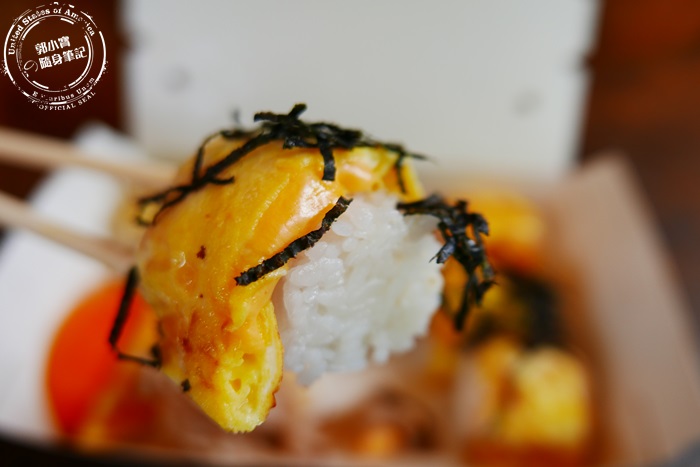 | 起司蛋,這起司蛋一口吞下去也是超驚艷,上頭的蛋裡頭有厚厚的一層起司,微微融化的狀態跟外頭煎的金黃色澤的蛋皮,蛋的香跟起司的香濃在嘴裡交融,齒頰留香,那個香氣久久不能散去,真的味道超棒的尤其是那個起司,這樣搭起來的飯糰超好吃的,加上一些海苔做點綴,味道層次更豐富,因為這起司蛋的味道實在太驚艷,所以問了老闆娘是不是有在蛋液裡面加了什麼高湯之勒的?不然怎麼可以吃起來這麼香,但其實沒有,老闆娘說是因為他們的起司是有特別挑選過的,所以吃起來的味道才會這麼的特別,天啊~徹底的愛上這一家的飯糰,因為艾編是起司控來著。 |