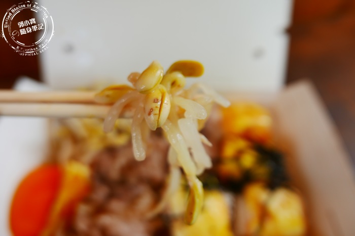 | 為了兼顧到上班族的營養健康,飯盒裡面還會有一些蔬菜,但是每天的菜色不一樣喔!今天吃到的是豆芽菜,非常的爽脆沒有過多的調味,就是很簡單的吃豆芽菜的原味,有鹹鹹的味道,吃起來很有脆度又清爽,他們家用的豆芽菜是一般在韓式料理店,會看到的那種頭比較大的豆芽菜,口感佳保水度夠,很好吃。 |