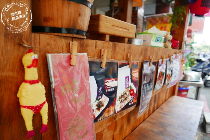 | 木製的攤位上有很多的裝飾品跟照片,還有超搞笑逗趣的雞,應該是怕如果有小朋友等得太無聊可以拿來玩吧!壓一下聽雞的叫聲也蠻療癒的,照片大多是店家的飯糰照,每種都看起來蠻厲害的說,很可口的感覺。 |