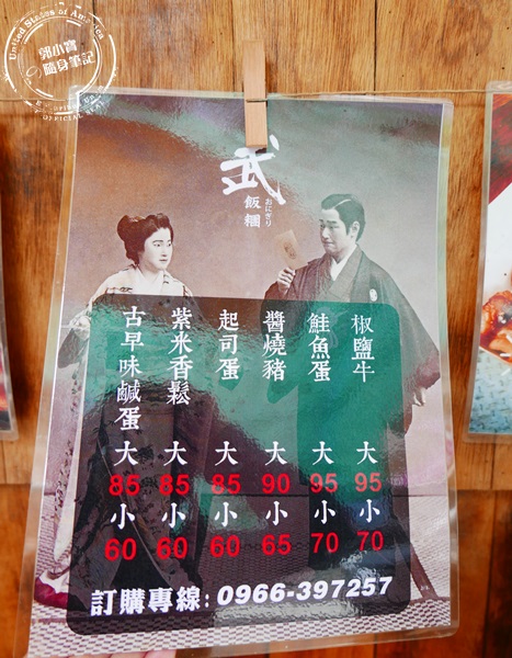 | 夾在攤位上的菜單,是不是很日式,這是他們家的飯糰口味,這樣六種就賣得嚇嚇叫了。 |