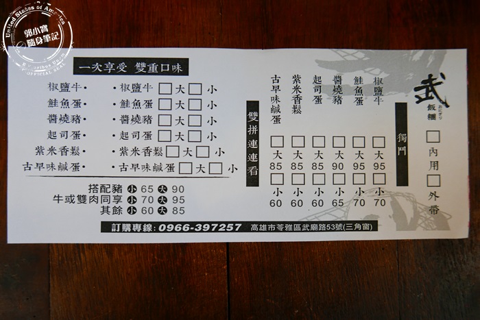 | 高雄著名的武廟斜對面的三角窗有一家很日式的小攤子,店名就叫武飯糰,顧名思義就是飯糰的專賣店,外觀還蠻顯眼而且這一家店人氣很夯,想必當地人都對這家店不陌生吧!攤位前方有長板凳,就是他們家的內用空間,像是吧台般的感覺,自從前陣子看到電視介紹他們家,一直想來試試看,可惜他們家的預約專線超級難打,後來上他們的粉專去看,發現是他們不定期休息,所以想來朝聖的朋友們記得要先上粉專去看他們有沒有營業唷! |