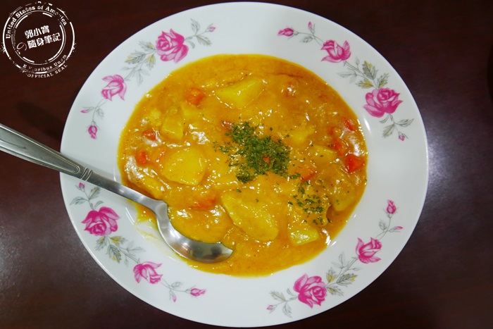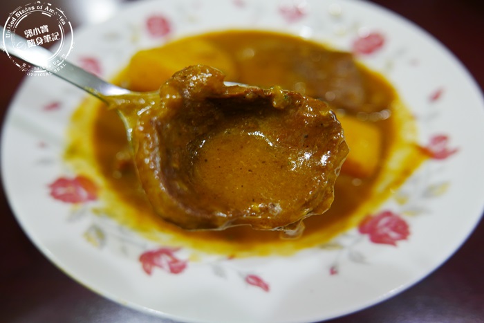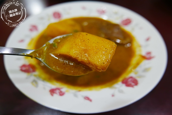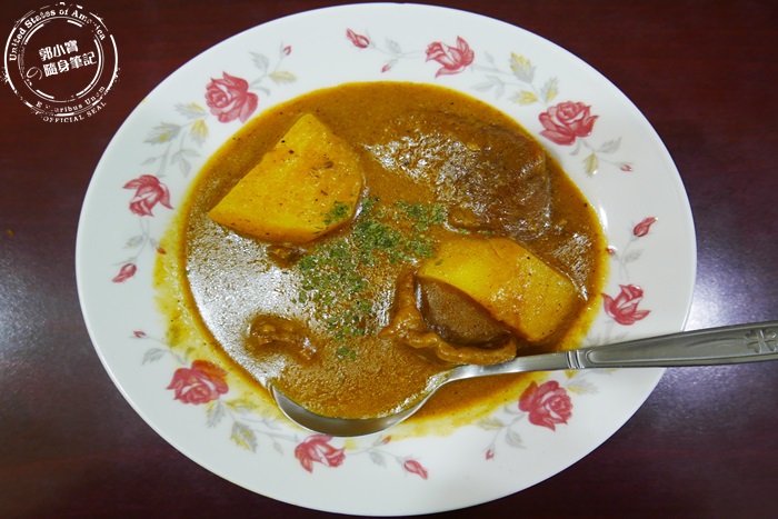 | 馬鈴薯不要看他是這麼大一塊喔,牙齒輕輕一咬就分離了,整個吸收了咖哩的香氣,口感綿密變得非常有味道,燉牛肉咖哩味道會有點酸酸的,也是非常的下飯而且非常的開胃,重點份量其實都不算小。 |