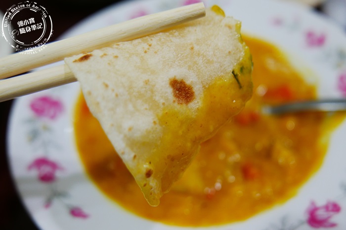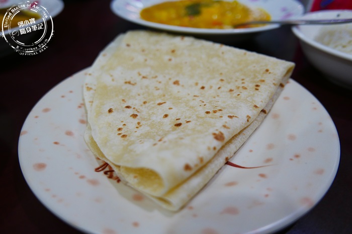 艾編這次就沒有點捲餅吃,因為捲餅跟烤餅的餅皮是一樣的,所以選擇單點餅皮,直接拿來沾咖哩吃,這樣是很正統的印度吃法,艾編以前去國外的時候就是這樣吃的,只是國外的印度餐廳衛生方面其實沒有那麼的乾淨整潔,要吃烤餅的時候用手撕會比較有體驗當地人的樣子,當然手要洗乾淨,不想用手用筷子也是沒關係的,他們家的餅皮是有點厚度的,麵皮的筋性是很Q的,咀嚼在嘴裡會感受到麥的香氣,而且口感很好,烤的有點酥酥香香的,沾上咖哩變得更有味道更好吃,真的會忍不住一口接著一口吃。
