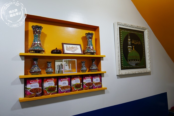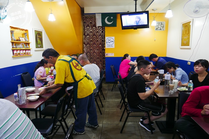 | 店裡的空間不大座位也不算很多很寬敞,但是冷氣加電扇讓這小小的空間變得很涼爽舒適,簡簡單單的裝潢,還有非常跳的顏色,很亮眼,牆上也有電視讓客人用餐過程中不會太無聊,最重要的是還有巴基斯坦的國旗高掛在牆上,清楚明瞭他們家是哪一國料理。 |