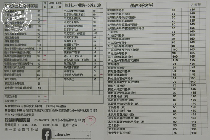 | 菜單很大一張,蠻豐富的好像什麼都有,但分類其實就是咖哩跟墨西哥烤餅、飲料、甜點、沙拉還有湯,只是口味蠻多的,還有一些比較有特色的料理,有AB套餐可供加價,整個菜單的填單欄位也都非常的清楚,價位上真的算蠻便宜的,這樣的異國料理一個人吃一整個套餐大概才一、兩百塊這樣,艾編覺得就可以吃蠻飽的。 |
