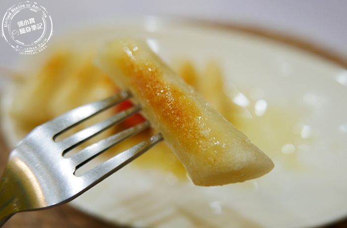 | 把韓國年糕做成甜的也是蠻特別的,很像我們在吃燒烤吃到飽,最後的甜點是烤麻糬,有點類似那樣的感覺,只是日式的麻糬是片狀的,沒有年糕那麼厚,比較軟,而年糕煎過之後,表皮有鍋巴的香氣,但是口感比較硬,整體吃起來是Q軟,米香十足,搭配煉乳的牛奶香醇,甜滋滋的味道好迷人。 |