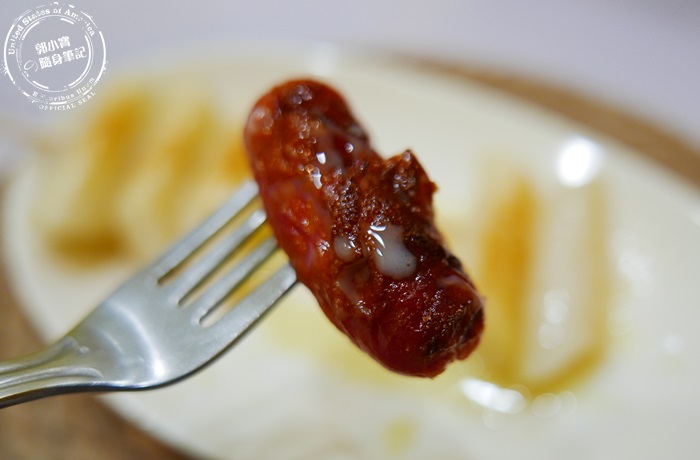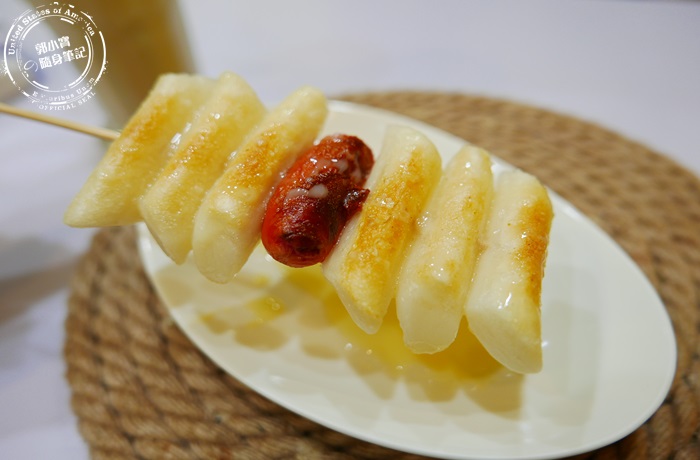 | 年糕串裡頭有鑫鑫腸,鑫鑫腸本身的味道蠻重的,所以剛好可以中和掉嘴巴裡的甜,賦予這年糕串更多層次,畫龍點睛的效果,這個鹹味來的剛剛好,而且吃完鹹的就是要繼續吃甜食,這樣交替著吃才不膩口。 |