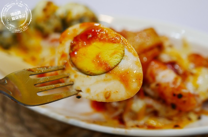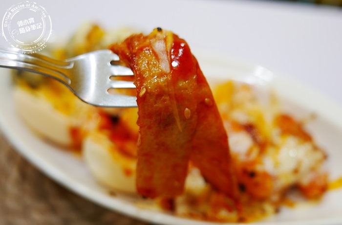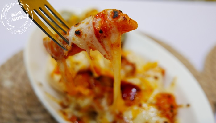 | 說實在的他的調味吃起來跟辣炒年糕是一樣的,差別在於年糕有先煎過,多了這一步驟就很不一樣,年糕多了鍋巴的香氣,口感比較硬比較有嚼勁,不會像一般煮過的口感偏軟,但是艾編覺得比較適合年輕人吃,長輩們應該會覺得不好咀嚼,會咬到嘴巴酸,外頭包裹的醬料甜甜辣辣很道地的韓國風味,搭配烤的微焦氣息的起司,奶香濃郁讓整體的辣度變得溫和,牽絲有彈性的起司跟年糕一起吃香氣很棒,越嚼越香。 |
