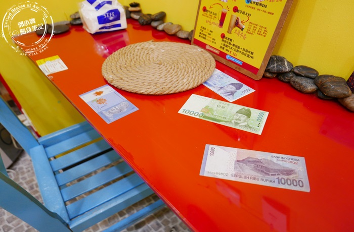 | 靠牆壁的這一排桌面,桌面上放了些國家的貨幣,不只有韓國的還有馬來西亞,跟蠻大張的台幣,不知道是不是客人捐的,不過這樣擺放在紅色的桌面上,裝飾起來還不錯。 |