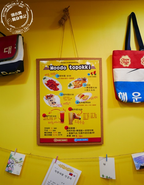 | 另一面牆掛著大大的菜單,還有一些韓國來的包包,營造出的氣息都很繽紛,很吸引年輕族群,菜單也設計的很可愛很吸睛,整家店的感覺有別於以往去過的韓國餐廳,艾編倒是蠻喜歡他們家的。 |