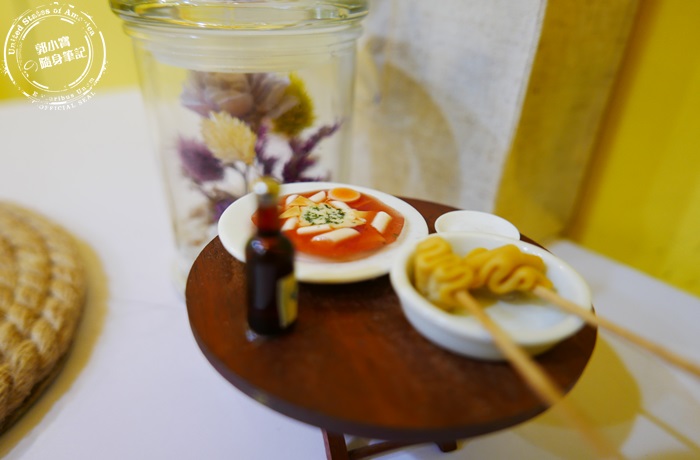 | 桌邊一角的裝飾品超級可愛的,除了目前很夯的乾燥花之外,這迷你小圓桌上的辣煎年糕,韓國關東煮,縮小比例做的唯妙唯肖,可愛極了,都是韓國經典美食,看到都想衝韓國去了。 |