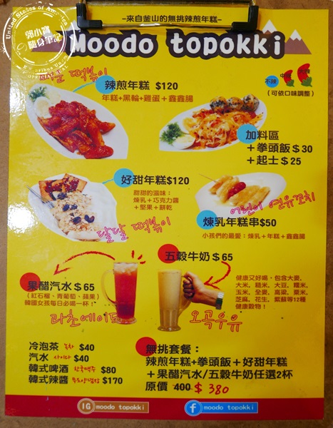 | 從一開始進到店家前後,看到的都是這一張菜單,種類不是很多,最主要的就是煎年糕,然後再加以變化,有甜有鹹也有飲料可以點,兩個人以上其實就可以點套餐來吃,價位上也不會覺得太貴,跟一般印象中辣炒年糕的價位差不多,但這裡在崛江附近,又是這麼有特色的小店,其實也算是蠻平價的巷弄美食。 |