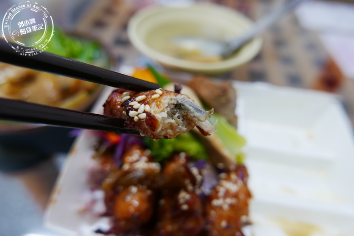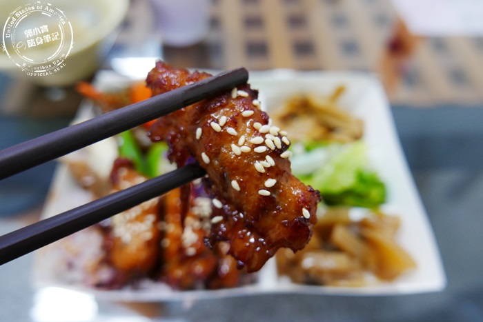 | 素排骨裡有小驚喜唷!一口咬下裡頭咬到一根脆脆的東西,是牛蒡來著,越嚼越香,素排骨吃起來很有味道,炸過的香氣跟蜜汁醬香,在嘴裡好厚實的味道,口感很Q軟有彈性,超級下飯的,真的好好吃唷,外層白芝麻微微點綴增加香氣,店家調味很用心。 |