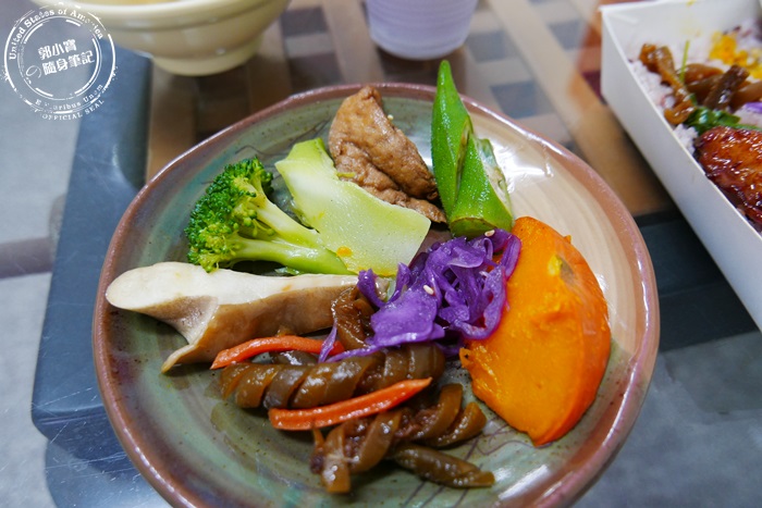 | 老闆娘很貼心的拿盤子來給艾編的,因為菜色太多太豐富,沒有夾點放旁邊根本不知道從何下手吃起,深怕個不小心,就會掉的滿桌都是的,有小盤子暫放相當方便,每樣東西都放一點,五行蔬菜通通有,配色很美很繽紛,有南瓜、秋葵、油豆腐、綠花椰菜、杏包菇、胡蘿蔔絲、紫色高麗菜醃漬物、還有類似海帶捲捲的,吃起來脆脆的,口感超豐富的,南瓜綿密油豆腐軟彈豆香味濃郁,花椰菜新鮮脆甜,紫高麗菜酸酸甜甜的,杏包菇豐富水感,全部調味都很清淡美味,非常養生健康,完全無負擔。 |