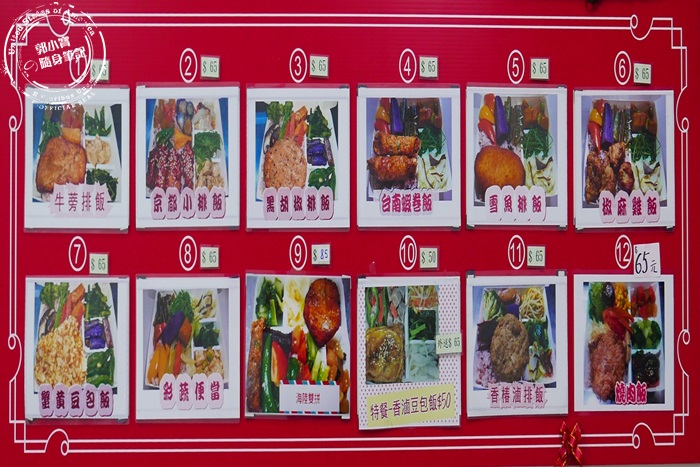 | 牆上的菜單店家很貼心的都有搭配圖片讓客人參考,看上去非常的豐富完全不知道怎麼選擇,尤其是像艾編這樣子第一次光顧,只好直接詢問店家人氣最高的是哪個,於是選擇2號餐,他們家的餐點價錢還蠻便宜的,最貴的也才$85,看起來相當精緻養生,徹底喜歡這一家素食便當。 |