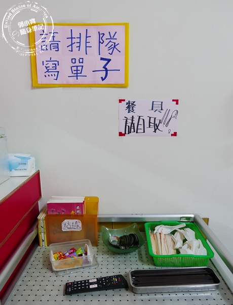| 點餐櫃檯旁邊櫃子上擺放餐具需自取,也有提供免洗的餐具,外帶或內用的都可以使用,但是基於環保概念,還是多加利用店家提供的餐具吧!客人如果太多的話就必須要做填單子的動作,然後乖乖排隊,店家滿多的顧客都來自附近的居民,所以有時候會有媽媽帶小朋友來,店家很貼心的準備小糖果可以讓小朋友乖乖聽話,這裡真的像家一樣的溫馨又富有人情味。 |