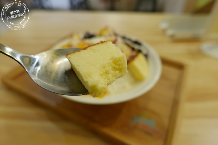 | 一碗冰有兩塊起士蛋糕,屬於輕乳酪蛋糕,不知道是不是店家手工製作的,艾編覺得很好吃,搭配雪花冰一起吃,不僅有優格香甜還有起士蛋糕的綿密香醇,微微的鹹度更是巧妙的融合在嘴裡,很不錯。 |