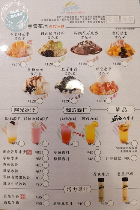 | 創意雪花冰有7種口味,還有冰沙跟韓式西打,也有果汁的部分,每桌桌上都有這樣一大張的菜單,品相要說很豐富其實也還好,算是比較精緻型的,東西感覺都是新鮮天然無負擔的,可以讓人比較安心吃的開心,價位上其實冰品這樣還蠻大份的至少都可以兩個人一起吃,所以價格也不算太高,幾個好朋友一起來點個幾樣雪花冰,分享著吃,不用花大錢也能享受。 |