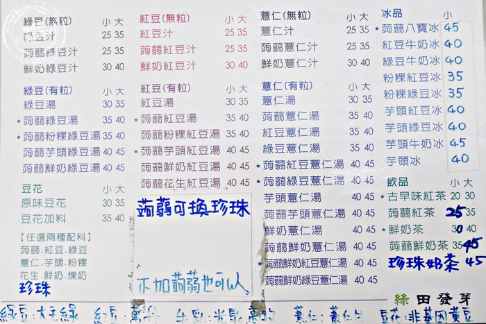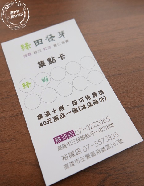 | 店家有集點卡唷!集滿十點就可以換40元的商品,很划算說,大家可以多多蒐集唷!這家冰店在左營裕誠路上也有一家,已經十幾個年頭的總店,原名蒟蒻綠豆屋,在近期更名綠田發芽,今年在熱河一街以嶄新面貌開啟第二家店,雖然艾編沒去過左營店,但這家2店給了艾編滿分級的享受,他們家特別注重養生健康,天然古法純手工熬製的甜品,絕不使用化學添加物,完全是最真材實料的古早味,很推薦大家來試試看唷! |