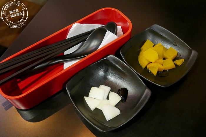 | 點完餐後,會送上餐具跟小菜,小菜有醃蘿蔔跟沾醬生洋蔥,醃蘿蔔吃起來味道一般,沒有太爽脆,酸甜味也沒有太合我的口味,生洋蔥吃起來很脆甜,豐富水感還有濃濃洋蔥的辛香,沾上炸醬吃,就是最清爽美味的開胃菜。 |
