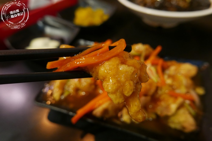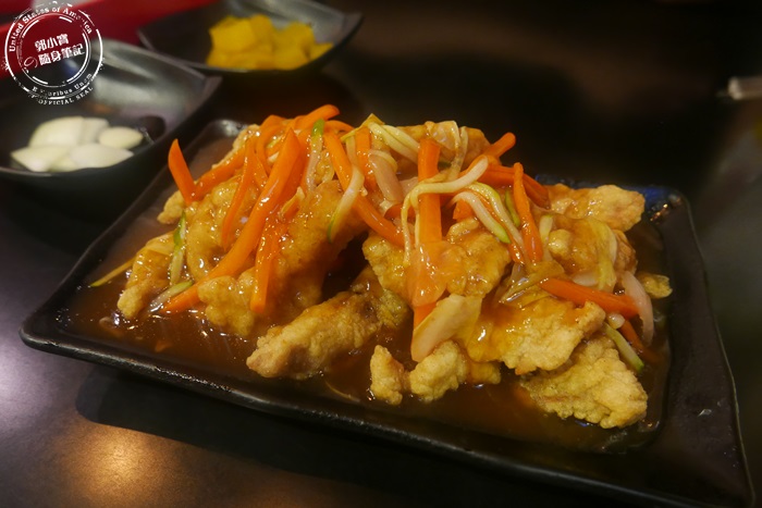 | 這盤糖醋肉上桌,狂冒熱氣之外香氣陣陣撲鼻而來,每一塊都相當的厚實,豬肉吃起來很好咀嚼,不乾不柴,肉質非常的軟嫩有Q勁,應該是肥瘦剛剛好的部分,新鮮多汁香甜可口,外層裹的粉也不厚,薄薄的一層粉漿炸過後讓勾芡的醬汁吸附,吃起來就是酸酸甜甜的,開胃又美味,整個有中,超級好吃的。 |
