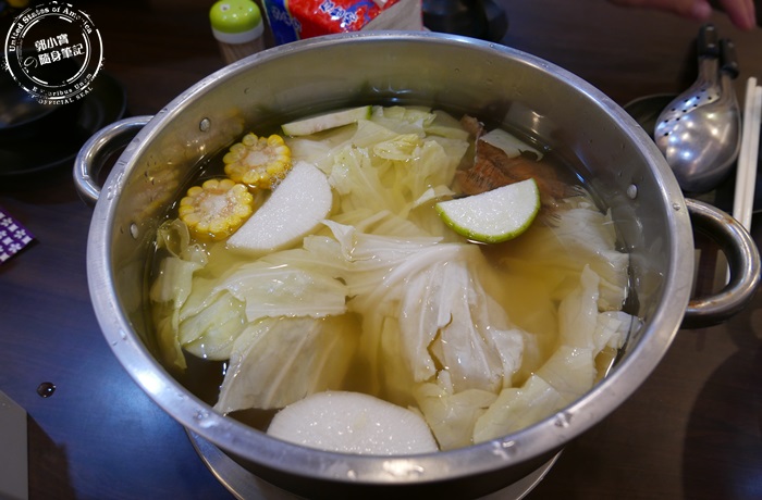 | 因為我們這次五個人來吃,老闆建議說,只用一套優惠套餐可能吃不飽,若再加海鮮塔兩層也要多700,所以乾脆直接買兩套比較划算,想想也是,那就直接點優惠組合兩份這樣,這是套餐組合裡的蔬菜湯底,大量的蔬菜跟高湯下去熬煮的,簡簡單單的蔬菜原味,一開始喝就蠻順口清香的。 |