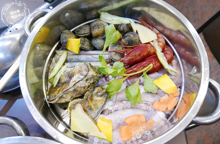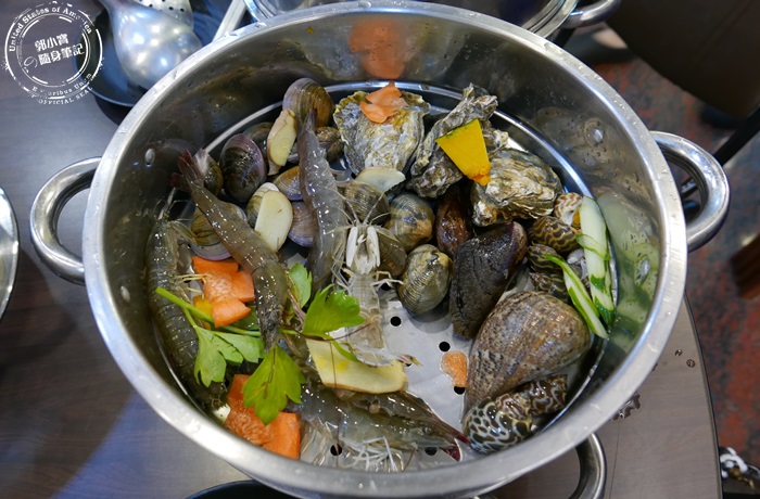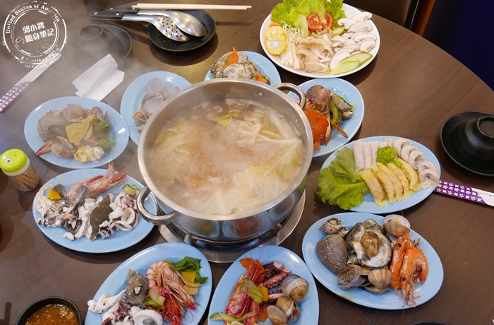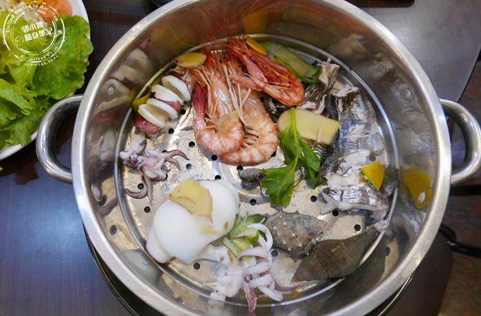 | 全部送上就是滿滿一大桌的海鮮,是不是超豐盛的,色澤繽紛鮮味十足,鍋裡不斷冒出的熱氣,這時候就可以添加菇類跟餃類還有肉品當火鍋吃了,雙重享受,感覺比去吃麻辣鍋還過癮。 |