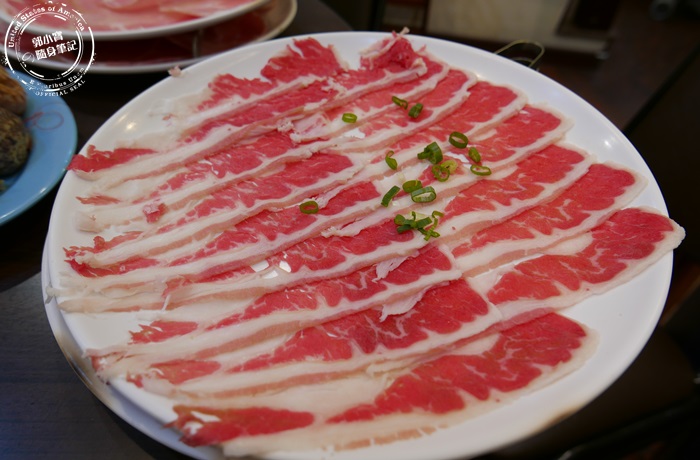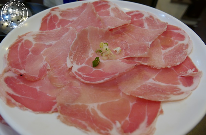 | 每一份套餐裡頭可以選兩盤肉,牛肉/豬肉任選,我們兩份套餐總共就有四盤肉,所以牛肉豬肉都叫來品嚐看看,這個牛五花看上去,油脂蠻豐富的。 |