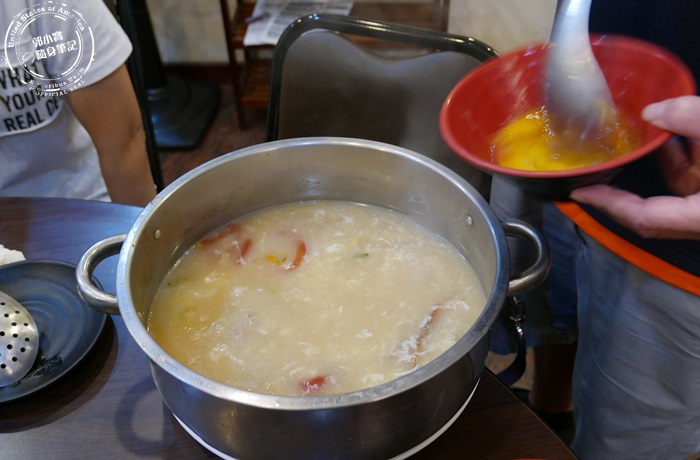 | 吃的差不多的時候,就可以告知老闆,老闆會將火鍋變化,升級成海鮮粥,先將白飯放進去鍋裡面,熬煮一段時間,然後再用餘溫熟化蛋液,吃起來才會有滑嫩口感的蛋花。 |
