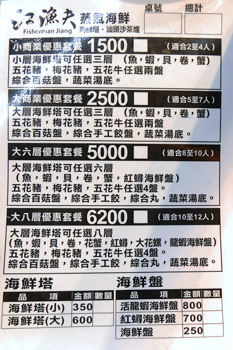 優惠的組合套餐兩套$1716,5個人平均下來一個人也才$350不到,還能多叫了一瓶飲料來解解渴,整個超划算,而且絕對能吃得飽,這天聚餐有人不吃海鮮,有人感冒戰鬥力減弱,所以我們這桌剩還蠻多的,以往看到這個蒸氣海鮮塔,以為一定要人很多來吃才划算,現在店家推出小資的套餐組合,就算兩個人來吃也能吃的開心,同時兼顧荷包,重點這裡的老闆人很親切又熱心,整個用餐過程艾編都覺得很棒,服務也很周到,如果你們跟艾編一樣喜歡吃海鮮,不用奔波到漁港去,現在市區就能吃到產地直送的新鮮料理,高CP值絕對飽到不要不要的。 |