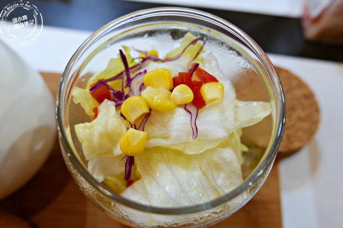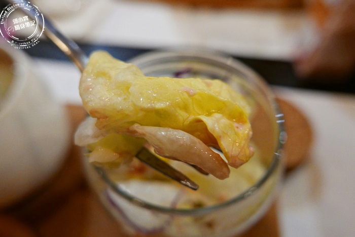 | 他們家的沙拉很可愛,使用玻璃器皿盛裝,一層一層鋪好的生菜,使用前要搖一搖,但是要蓋上蓋子,用玻璃瓶裝沙拉,不僅美觀也能保鮮,而且相當的方便快速。 |