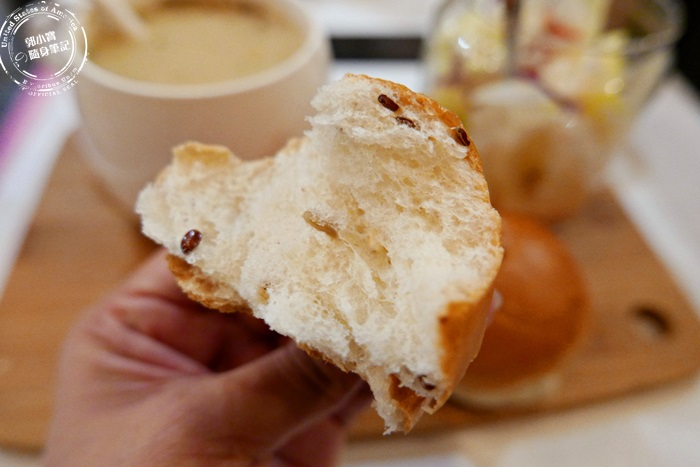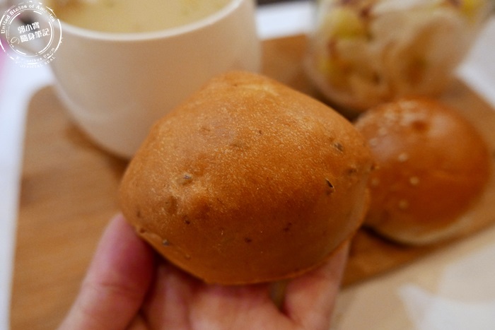 | 附餐麵包,麵包也不小顆唷!而且是有熱度的,放在手上溫暖手心的感覺很舒服,一拿起來便能聞到麵包香氣。 |