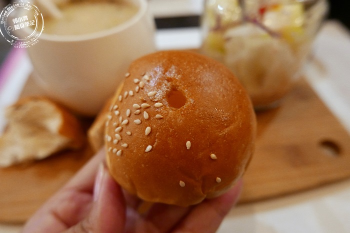 | 灑上白芝麻的餐包,看到上頭圓圓的大洞嗎?起初艾編一看到只覺得是一般有包餡的餐包,沒有什麼太特別⋯ |