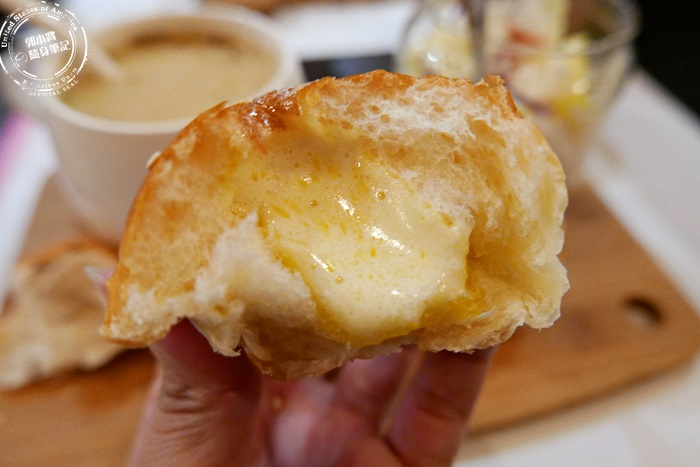 | 咬開後有如熔岩般的流瀉,差點Hold不住,這奶油餡太誇張了,比一般爆漿餐包的奶油還多了兩倍的感覺,綿滑鹹香的口感,奶油的香甜,餐包外酥內柔軟,濕潤度十足,口口都有奶油香濃,在嘴裡滋味相當好,原來剛剛看到的大洞,就是灌了很大量的奶油餡,這餐包不一會兒功夫艾編就吃光光啦! |