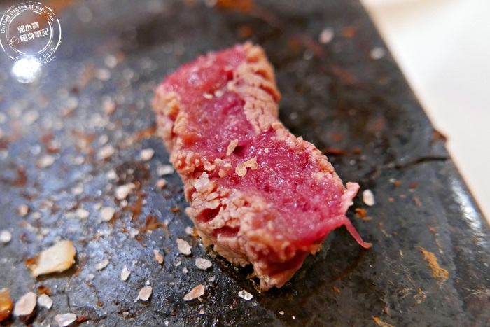 | 粗顆粒狀的礦物鹽,沾一點點就很夠味,牛排千萬不可以放在岩盤上太久,會容易過熟過老,如果導致肉質乾柴就不好吃了,所以吃岩盤料理還挺忙碌的,要邊吃邊煎邊切,過程中完全不會無聊,挺有樂趣的,不過因為岩盤的高溫,比較不建議帶小朋友來用餐,因為蠻危險的,如果沒有顧好的話,怕小朋友不小心亂碰,還是好好的享受兩人世界就好。 |