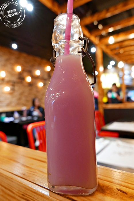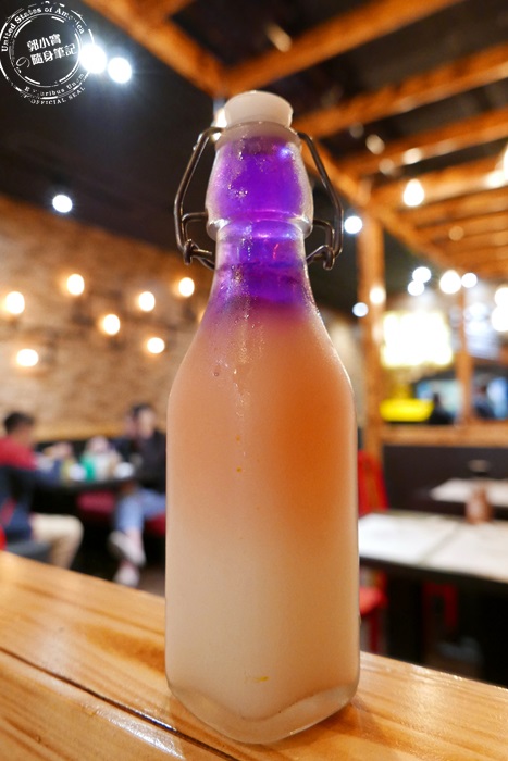 送上桌的漸層實在太美了,讓人不忍心破壞這個畫面,但是要喝一定要搖均勻,但其實搖勻之後的薰衣草色澤也蠻漂亮的,徹底征服艾編的少女心,但其實喝起來沒有太過於驚艷的味道,蝶豆花本身沒什麼香氣,喝起來像是可樂必思的乳酸菌飲料,酸酸甜甜的味道還蠻順口,甜度適中,算是比較特別的飲品,幾乎每個人桌上都有一瓶,現在這種漸層飲料正夯,少女們來一定要點上一杯來拍照打卡,因為真的美翻了。
