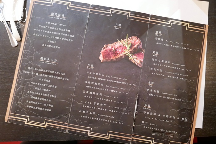 | 菜單一翻開,價位比艾編之前想去吃的那家便宜很多耶,這價錢太親民了,最貴的牛排也才$499,還沒有加一成,看到這價錢好感動呀!超適合小資族的,男女朋友來約會,感情升溫也不會花大錢心痛,牛排的部分有五種部位的選擇,另外不吃牛的話,也有雞排、豬排、魚排可以選,非常的貼心,每份餐都有附餐(濃湯、沙拉、麵包),還有飲料,一輪吃下來真的飽到不行,CP值蠻高的唷! |