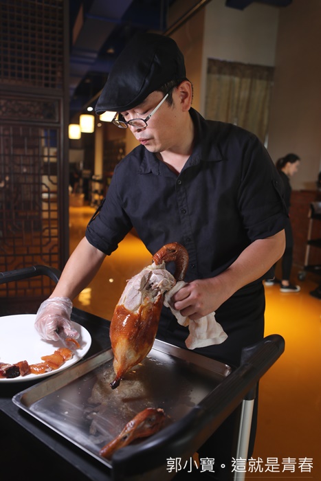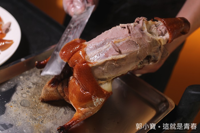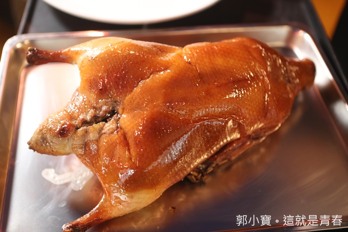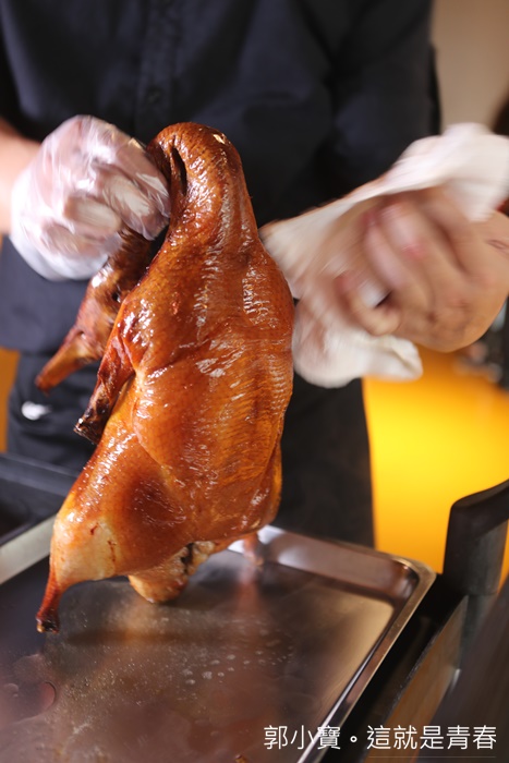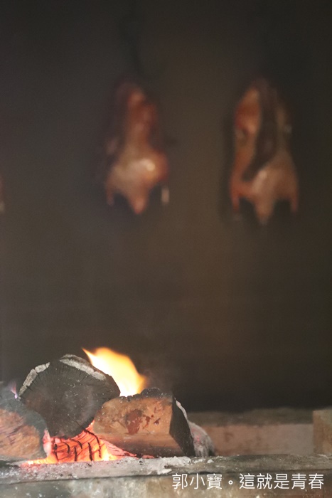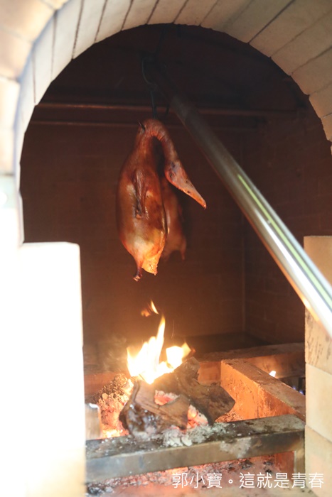 | 因為我沒有吃過北京全聚德烤鴨,所以我也不是那麼了解全聚德烤鴨吃起來應該是怎樣,不過透過窗戶可以清楚看到烤鴨在壁爐燒烤的樣子,使用的是龍眼木燒窯,感覺起來真的很厲害,途中就一直聞到陣陣的烤鴨香氣,這樣的烤鴨方法真的耗時費力啊!! |