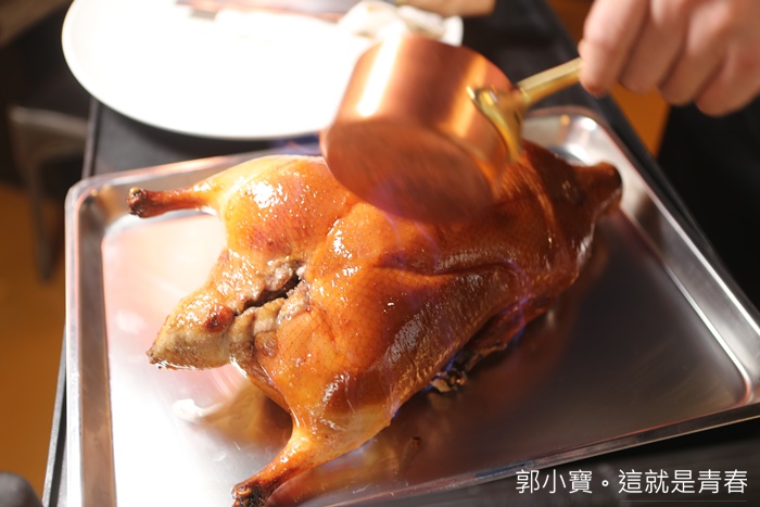 | 瞬間我們點的烤鴨就上桌了,看看這烤鴨的顏色真的超漂亮的,問了一下工作人員櫻桃鴨都挑重的,他們說他們都是挑選淨重三公斤的櫻桃鴨,三公斤算是肥美的櫻桃鴨了,烤鴨上桌的時候工作人員還淋上了(萊姆酒?),瞬間燃燒起熊熊的火焰阿,超美的。 |