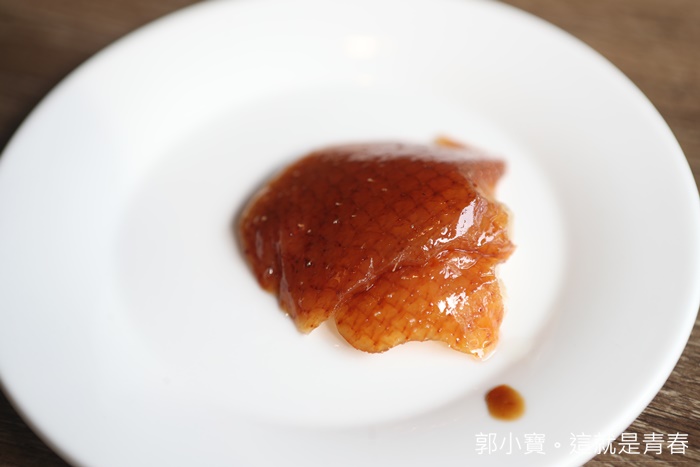 | 片皮鴨的數量感覺並沒有特別多,不知道是不是跟烤法有關係,先試試看一塊鴨皮,入口確實有驚訝到,那酥脆的感覺跟一般的烤鴨並不太一樣,尤其那鴨油真的超多的,滿嘴油膩膩且先填真的非常的美味,超推薦! |