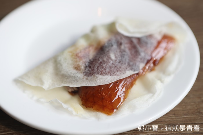| 包著荷葉餅皮跟甜麵醬入口也很美味,我個人比較喜歡厚皮的餅皮,金磚的皮是正統薄一點的餅皮,入口連餅皮跟甜麵醬也包裹不住那鮮甜的鴨油,也是因為夠油讓整體的層次豐富了許多,瞬間一整盤就被我們掃光了還一直喊著不夠不夠。 |