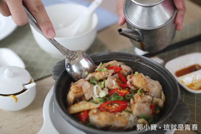 | 工作人員將醬汁淋到鍋裡後拌翻了一下,整個香氣都提了上來,這道煲仔飯我個人還真的是第一次看到,我入口其實有一點台式,但是滋味是非常不錯的,還有雞肉的部分也是非常嫩口的,帶點辣椒的香氣非常順口。 |