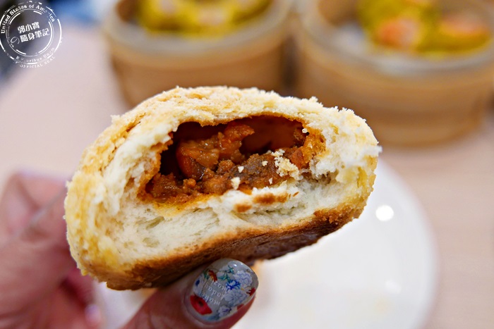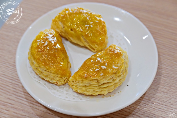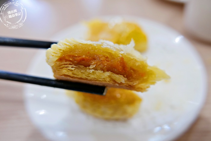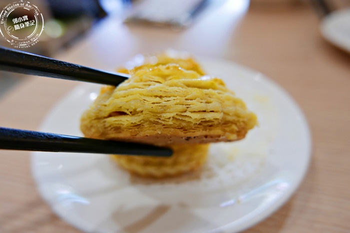 | 層層的酥皮隱約可見裡頭的叉燒餡,這種酥皮烤的叉燒酥,剛烤好的味道超香,這除了是港點,其實也能當甜點,因為現烤的需要時間,所以最後送上來當最後一道的甜品,也是挺不錯的喲! |