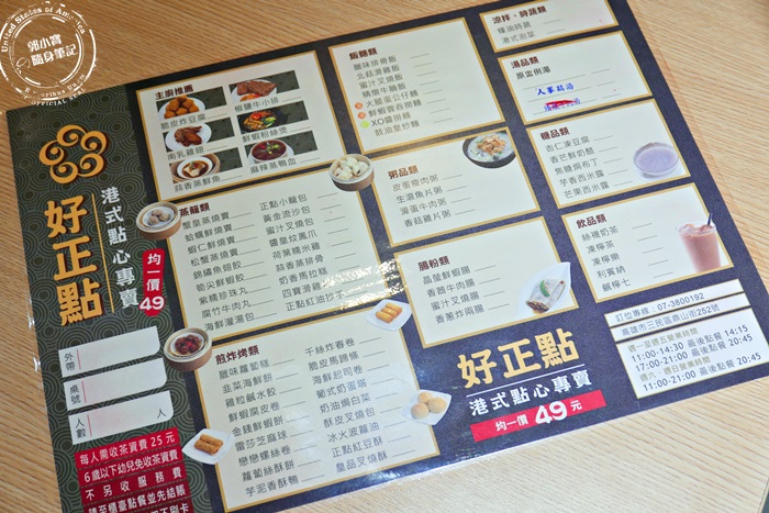 | 菜單就是以點心居多,也有分類,幾乎所有的港點這裡大致上都有提供,均一價$49真的非常便宜,來這裡吃的滿足也不傷荷包,許多港點的價位其實都貴到爆,這家主打49元太吸引人,還不另收服務費,只有收茶資每人$25,相當合理,感覺點越多省越多,不是吃到飽也能吃很飽,高雄有這麼一家平價港點,真的是太幸福啦! |