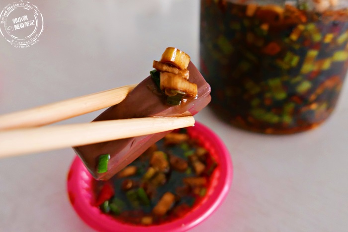 | 老闆娘送上他自製的蔥蒜醬油,冰涼的一大罐裝,裡頭滿滿的蔥、蒜頭、辣椒,滋味超級讚的,以往豬血都是直接沾醬油膏,沾老闆娘特調更是一絕,滿滿的蔥蒜香辣,濃濃的醬油香,超百搭的,這個我喜歡。 |
