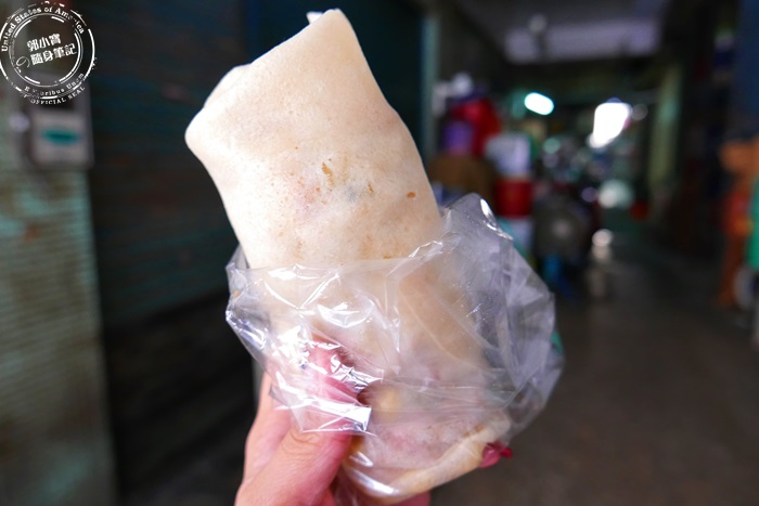 | 超大一捲的春捲,裡面塞滿滿的配料,超豐富的,全部都是自製的手工配料,蔬菜清爽脆甜,有柔軟的雞蛋,還有富有嚼勁的豬肉,豆芽菜脆的超有層次,濕潤多汁,一次吃到超多種配料在嘴裡的滿足感,重點是那個春捲皮,超級Q彈的,層層疊疊的厚度,好有嚼勁,麵香十足,加上大量的糖粉跟花生粉,甜鹹香氣足,吃起來好滿足唷!不過他們家的春捲吃到最後底部會比較濕一點,所以拿到春捲的時候要趕快吃完,趁蔬菜還沒出水之前。 |