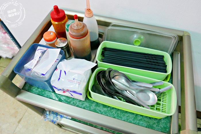 | 餐具跟醬料都擠在這個小櫃子上,一樣簡單,但是很齊全,不過他們家很可愛,有沾醬卻沒有小碟子,下方只有小碗而已,可能需要沾醬的話就是用小碗裝吧! |