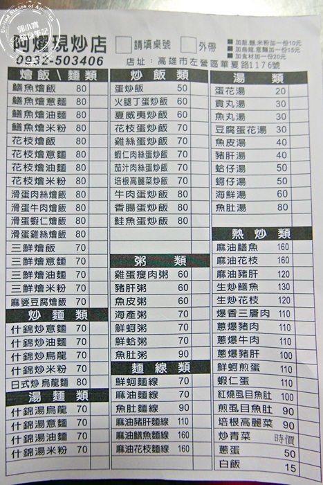 | 菜單超大一張的,完全不知道要怎麼下手,都有分類好,不過品項還是很多呀!有燴飯燴麵、炒飯炒麵、粥麵線、湯麵熱炒、還有很多現煮的湯,應有盡有呀!現點現做,而且價格好平價,不想在家煮,就來他們家吃吧!或是外帶回家都蠻不錯的唷!來看看要吃什麼好呢? |
