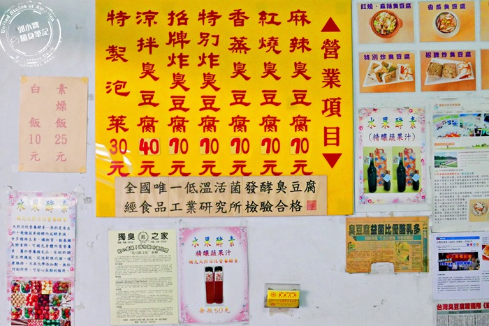 | 進門老闆跟老闆娘就會熱情的招呼,根本就不需要看菜單了,老闆娘大概會熱情到全部菜單都介紹過一輪,他們家有炸的也有蒸的,價位其實不算便宜,但是菜單周圍掛滿的保證跟肯定,都是他們家與眾不同之處,下方那兩行字,「全國唯一低溫活菌發酵臭豆腐,經食品工業研究所檢驗合格」,簡單兩行字,就能感受到他們家厲害之處,不得了的臭豆腐,不趕快點個一盤來壓壓驚怎麼行。 |