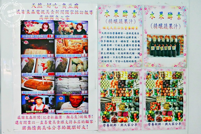 | 天然的臭豆腐,連媒體都大力推薦,還有他們自製的水果酵素,精釀蔬果汁,這家店整個超養生,全是他們手工製作,研發出來的,老闆娘們對他們家的產品可是很自豪的,而且他們家已經經營了將近20年歲月了,實在是太厲害了,這麼久的時間,艾編至今才踏入,有來總比沒來好,也算是挖到寶。 |